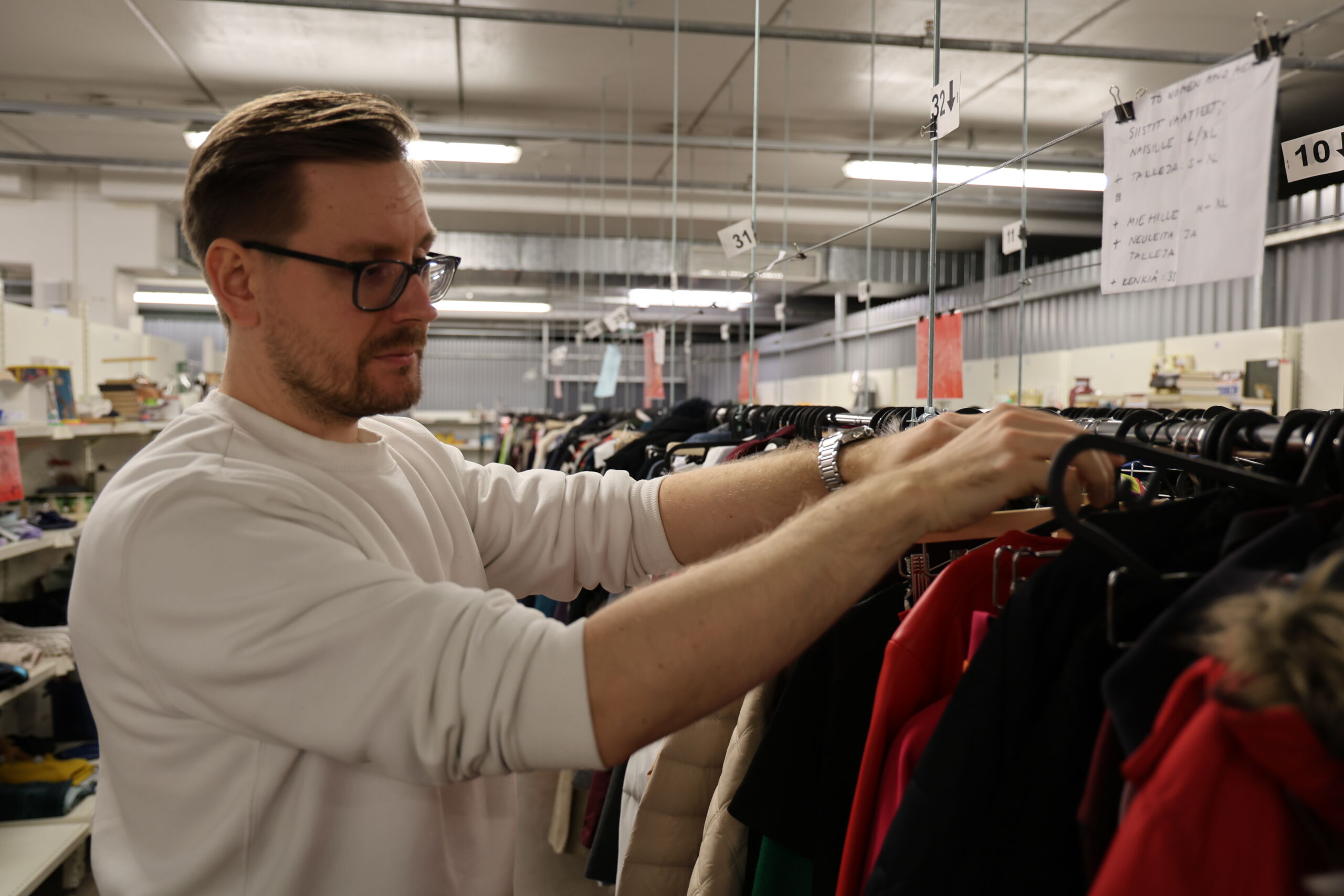 Kirpputoriyrittäjä Jesse Halme on huomannut nuorten olevan kiinnostuneempia ekologisista vaatteista. Kuva: Joel Hallenberg