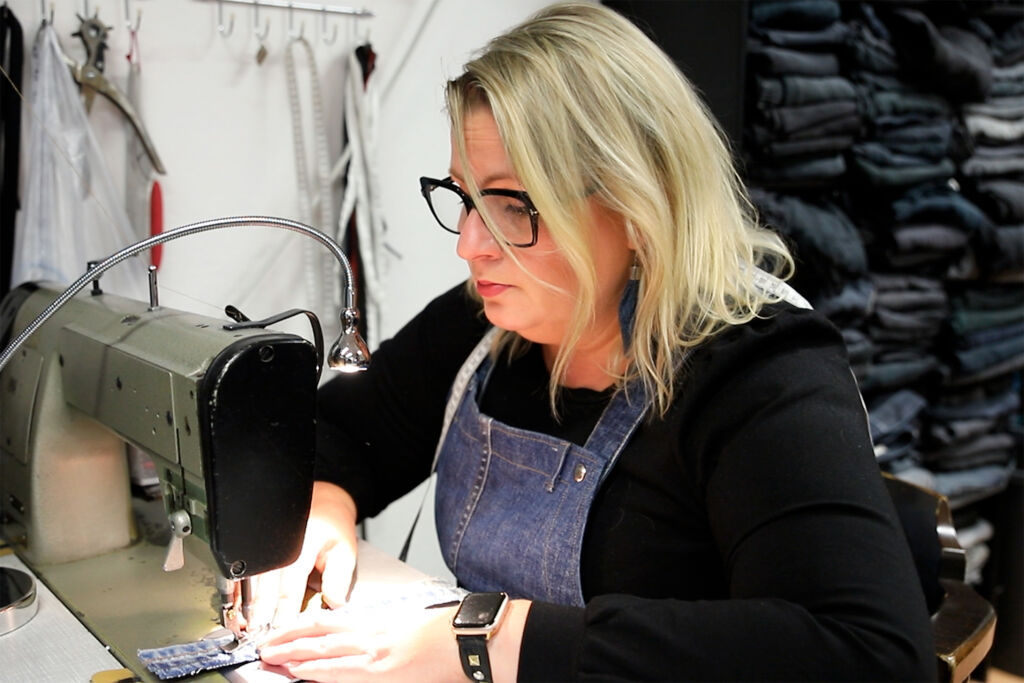 Miia Aaltonen työstää ompelimossaan kierrätetyistä farkkukankaista uusia tuotteita. Kuva: Jasmina Halonen